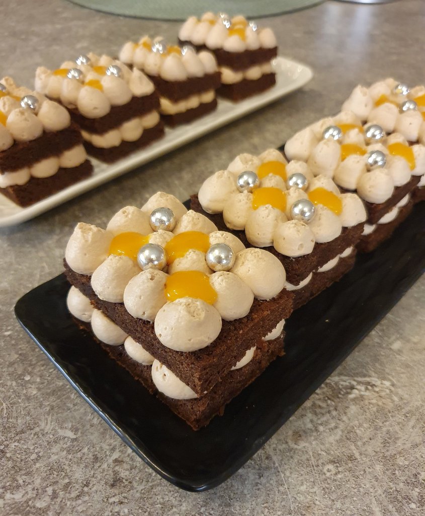 Resultatet blev en enkel bakelse som jag lovar att de allra flesta klarar av, en kladdkakebakelse med vispad mjölkchokladpannacotta och havtornscurd. Du gör med fördel alla delarna till bakelsen dagen innan det ska ätas och monterar samma dag som du ska äta den.